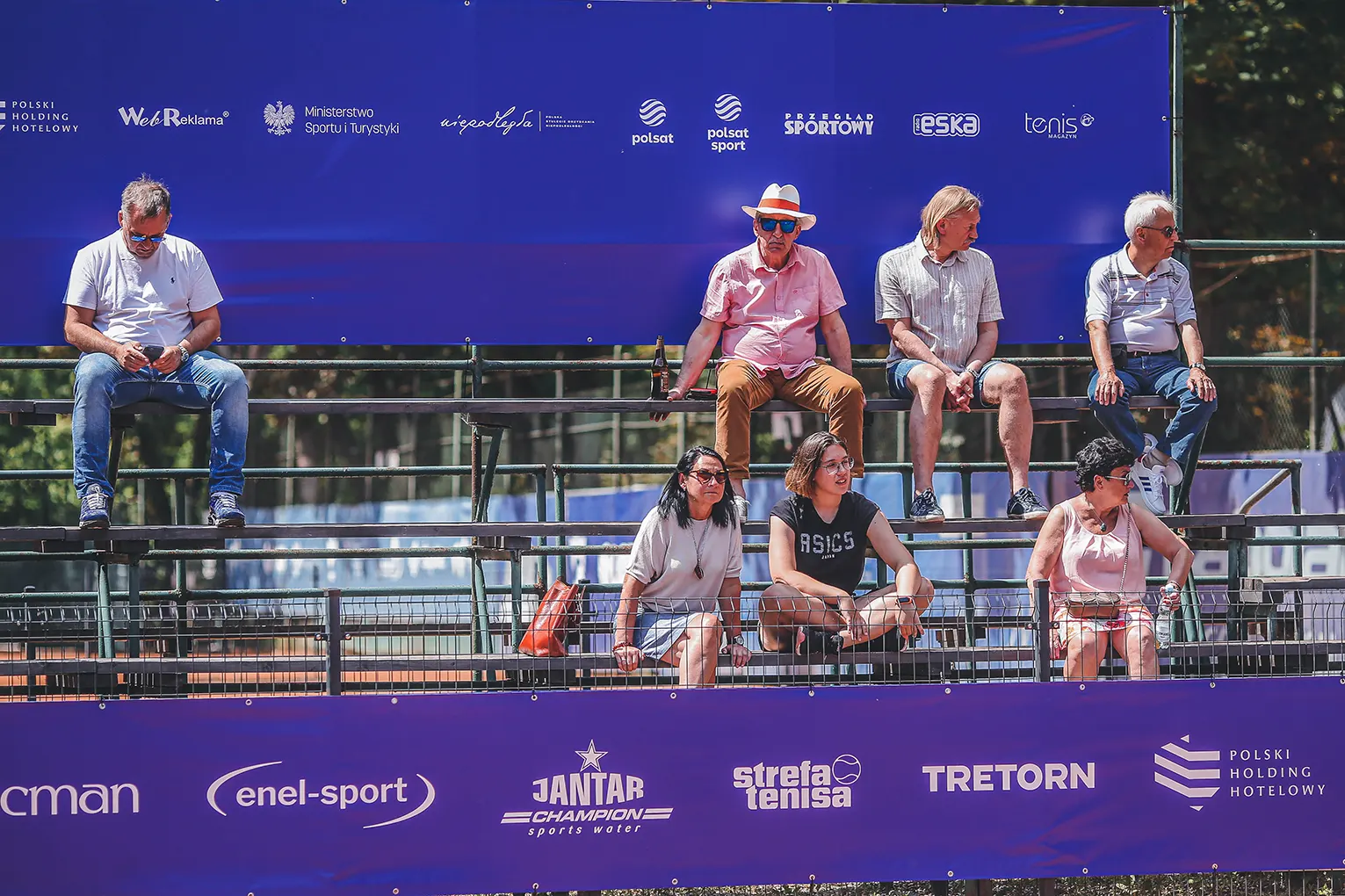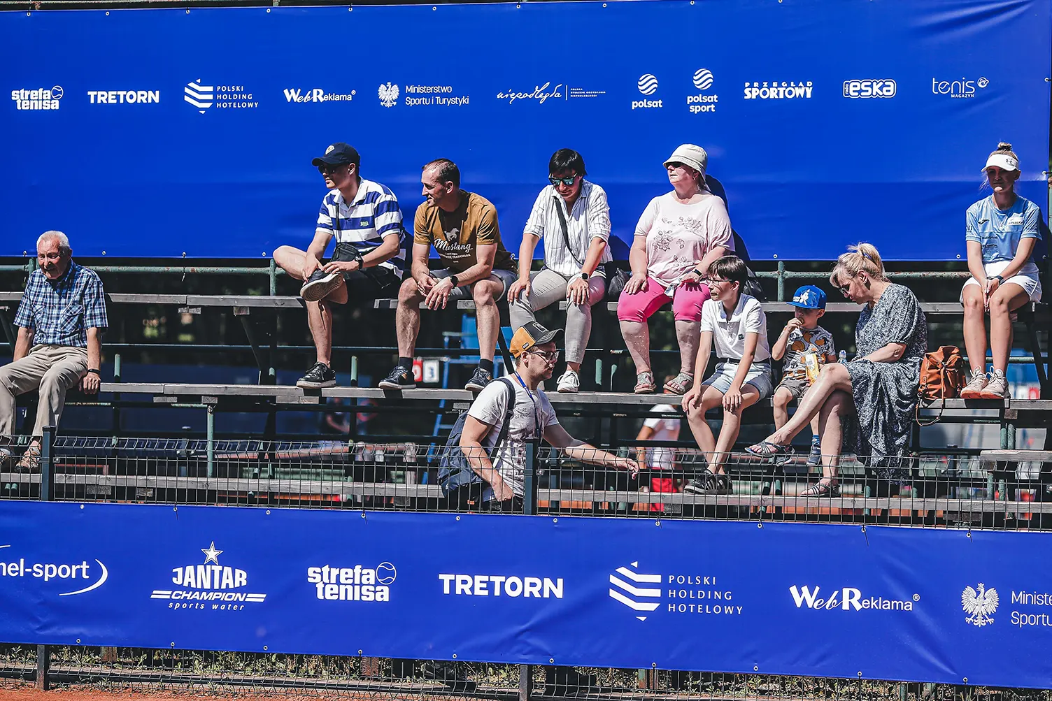 Widok trybun z logotypami sponsorów i partnerów